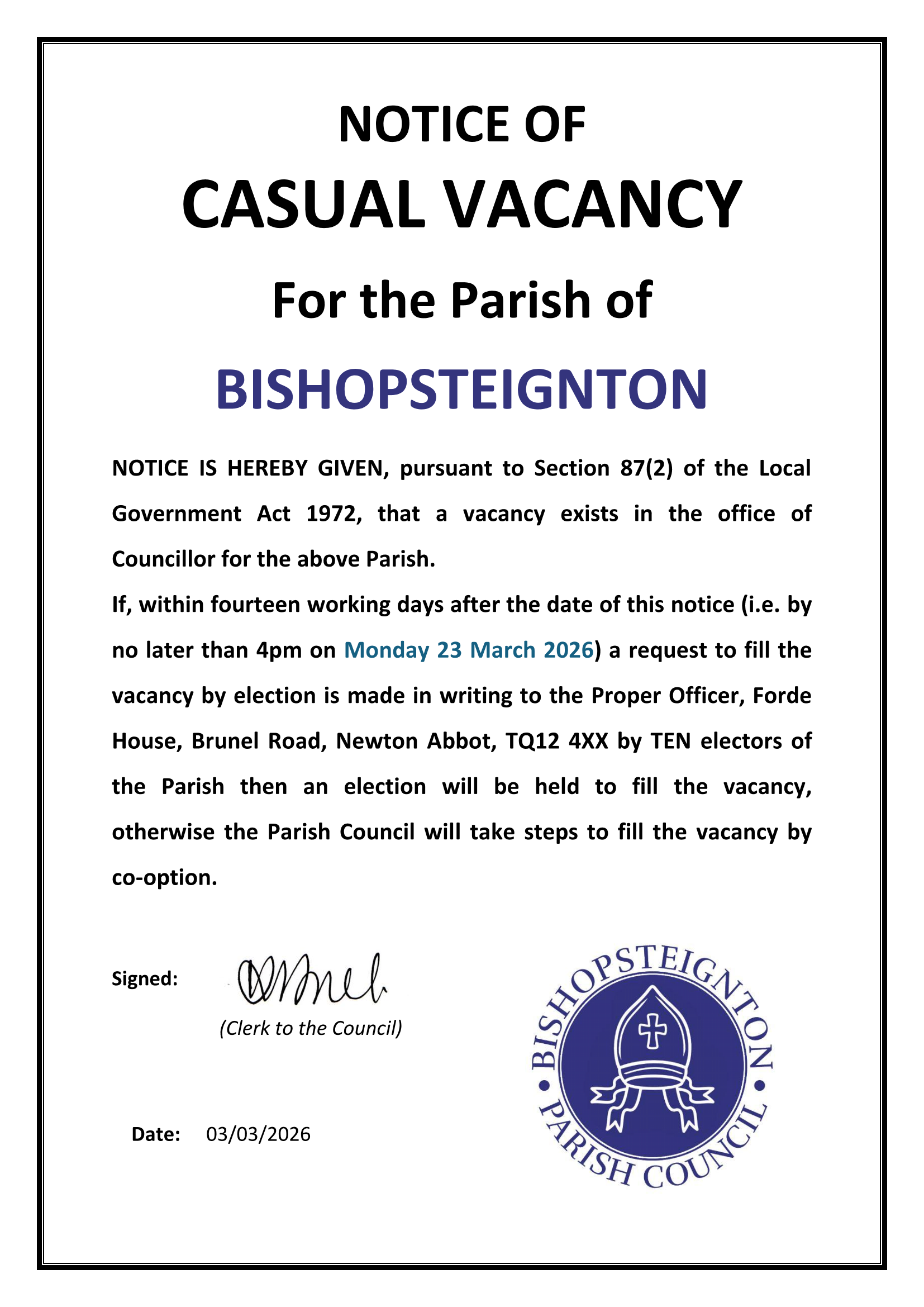 A Casual Vacancy Notice has been published (see below). This allows the public to request a by-election. Requests should be made to the electoral services department of Teignbridge District Council by 4pm on Monday 23 March 2026.